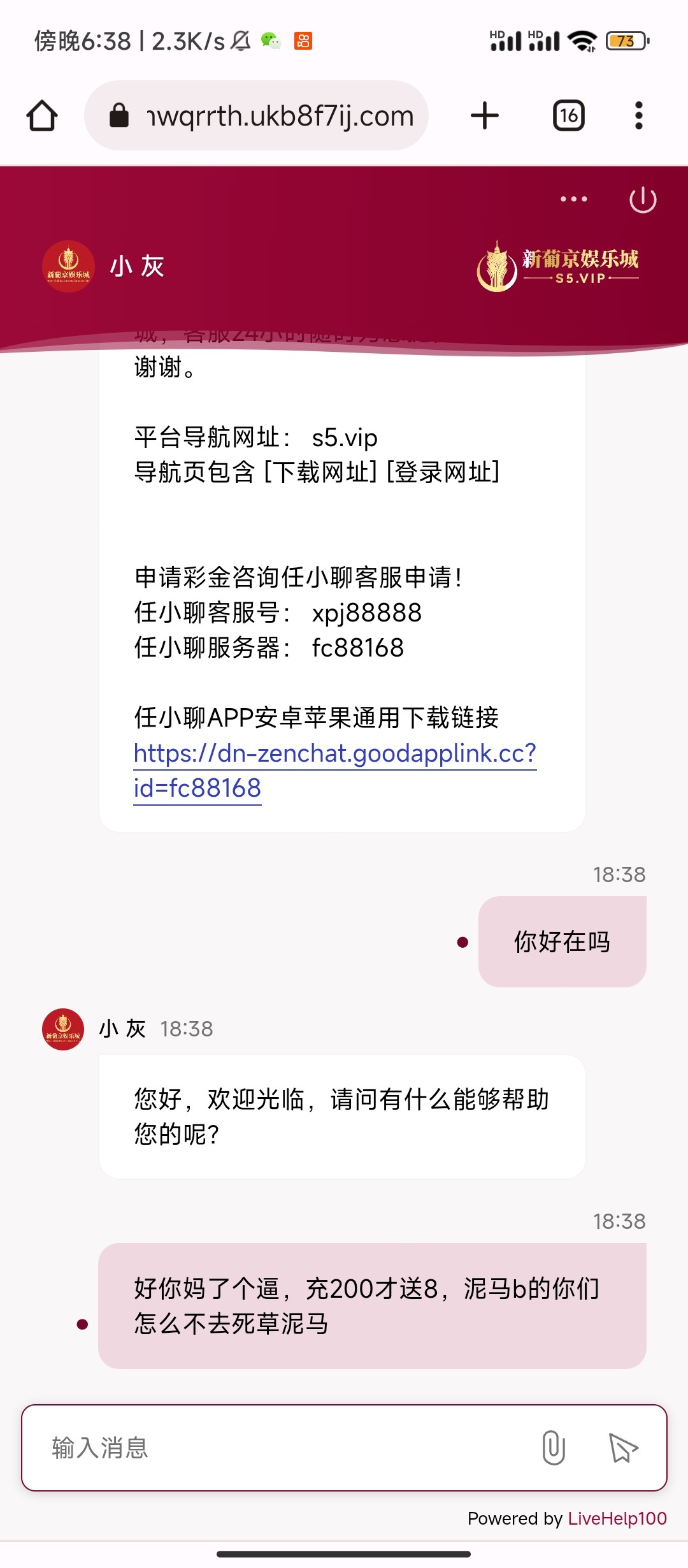 https://counter.sperimentsuggest.shop/tionally.html这个是客服链接,哈哈哈哈笑死我了狗急跳墙就验证码轰炸我。