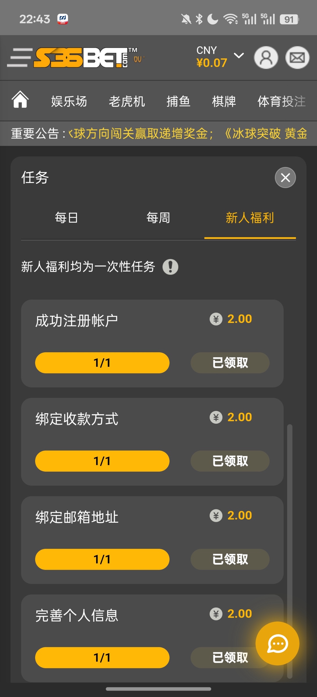 完成新人福利绑定任务可得10彩金,每日任务里有个8次捕鱼和8次老虎机的任务,选最低下注又可以拿6,运气差点的话到手14左右。