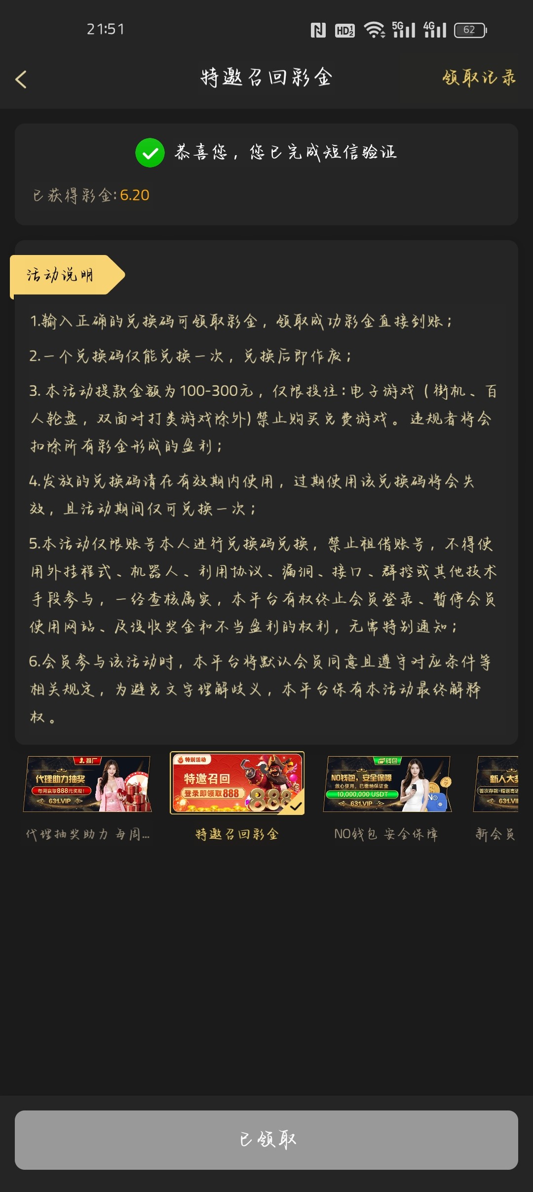 星子娱乐站长推荐的,应该都有充值过,我刚刚登录看了一下有一个特邀回归彩金自助领取的,最低6元,可以直接搜星子娱乐走贝壳的链接进去