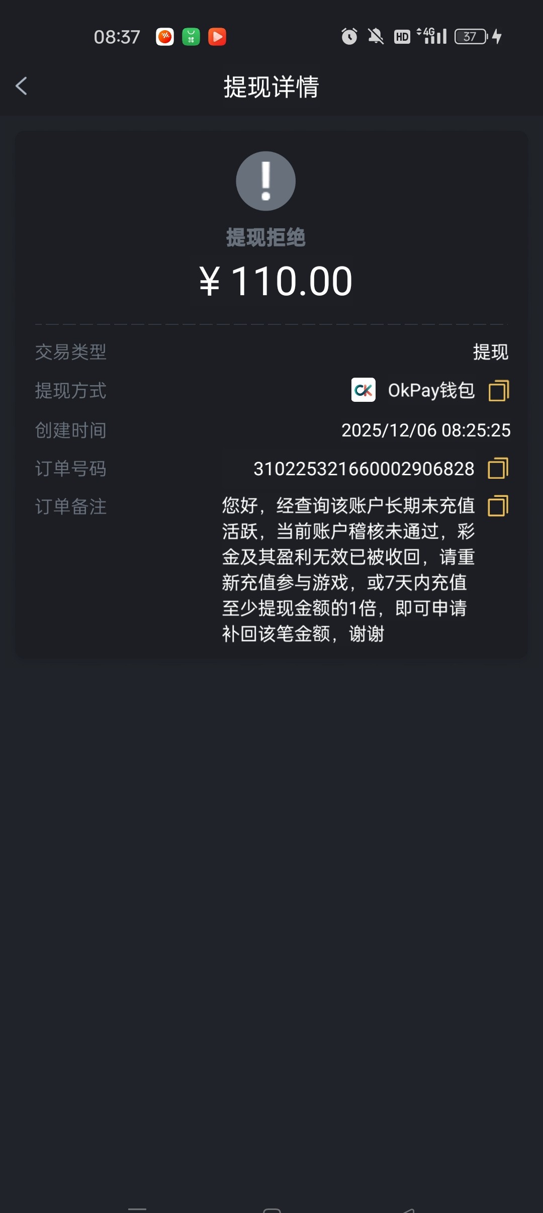提现退回来说久不充值 充值一倍提现金额就补回去 这种可以充值吗 几个月前充值过几次加起来一百后面就没有充值过了