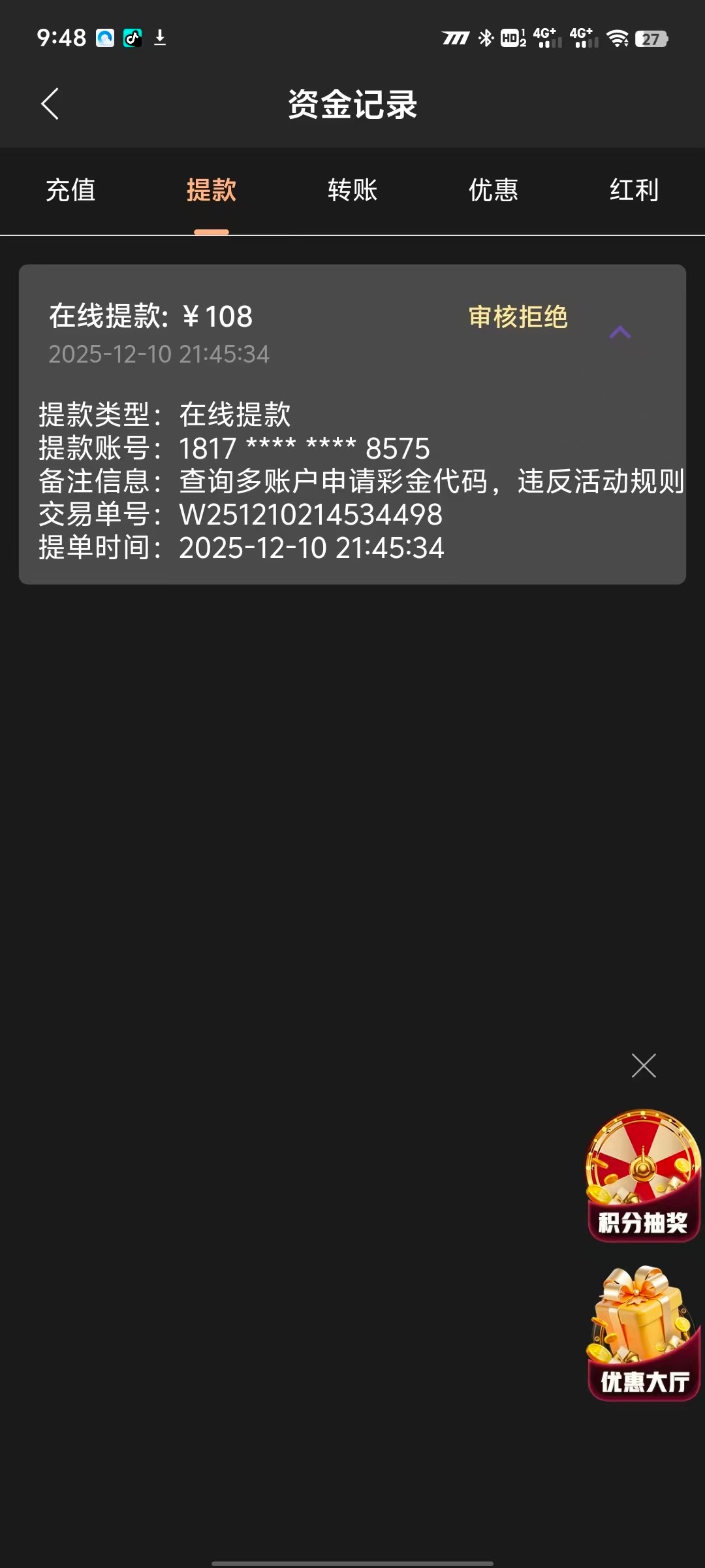 你是不是用了好几个彩金码