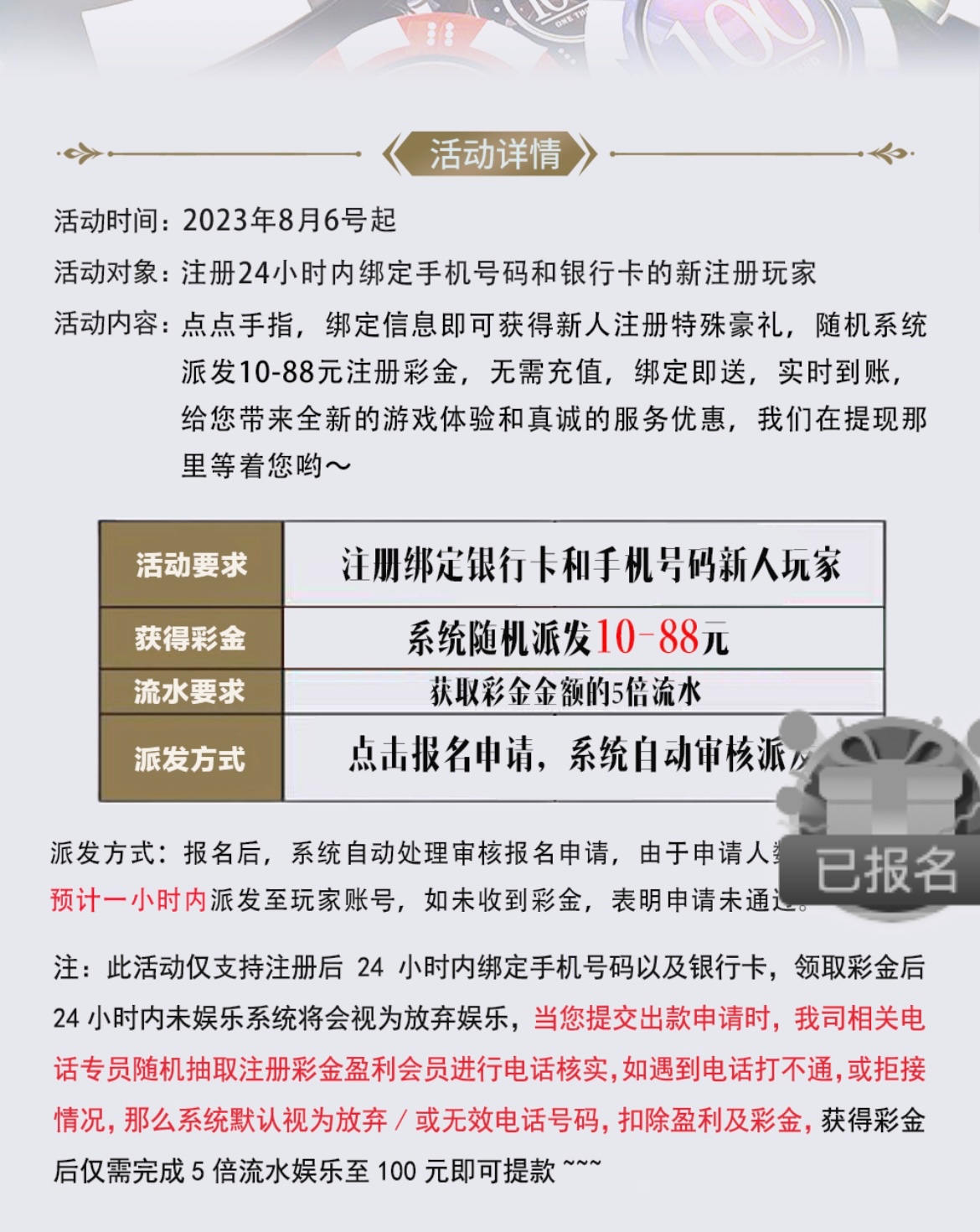 注册绑卡优惠里自助领取10~88彩金