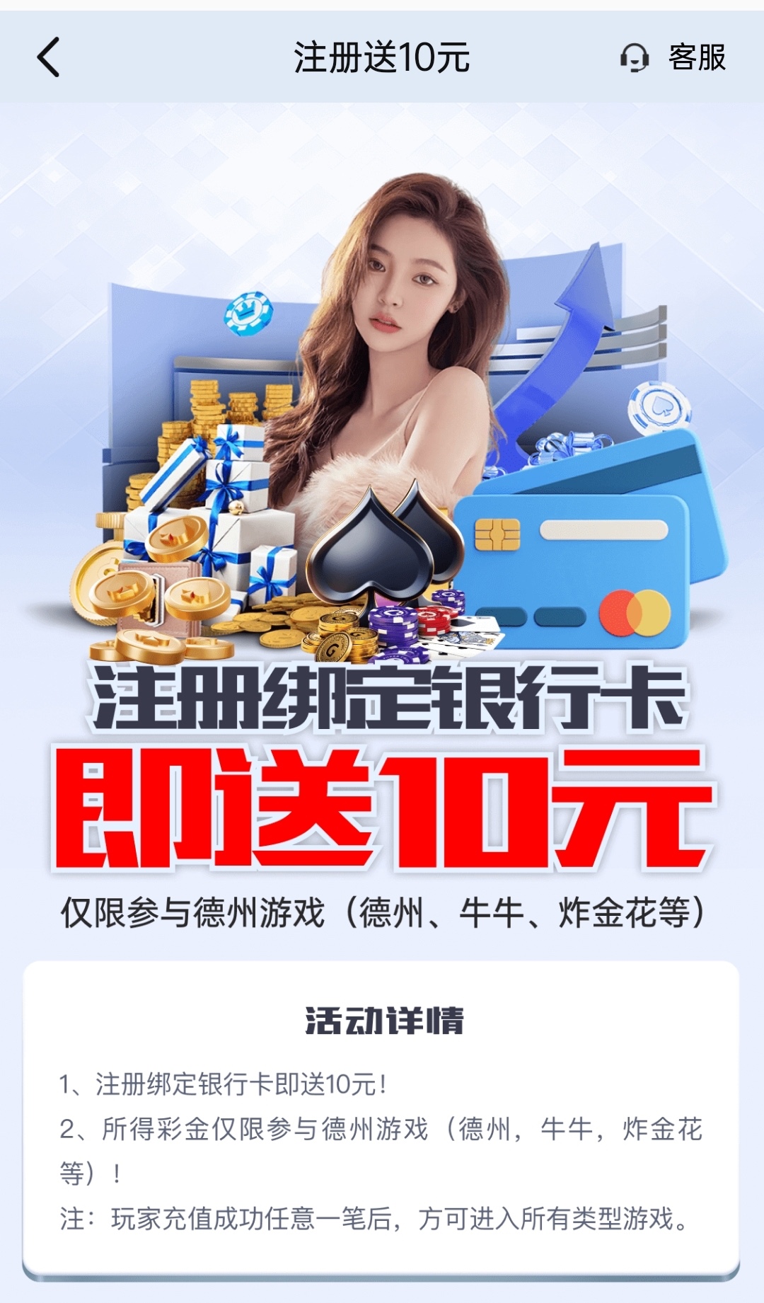 新用户注册绑卡秒10彩金,只能玩德州扑克无流水限制满100提,具体自测