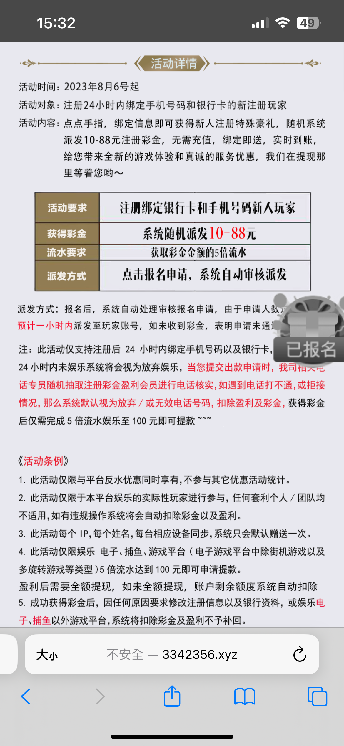 注册绑卡优惠里秒领88彩金,五倍水,满100提。